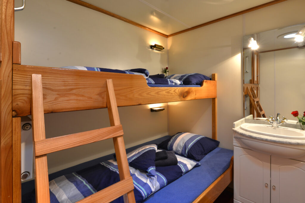 Aan boord is alles tot in detail doordacht. Het interieur lijkt vanzelfsprekend, maar dat is het allerminst. ‘Er loopt een compleet rioleringssysteem door het hele schip en overal zijn stroomvoorzieningen te vinden’, vertelt Joke. ‘Alles zit erin.’ Jan vult aan: ‘Een zeilschip kan serieus schuin hangen. Soms dagen achter elkaar. Dan moet je riolering het nog steeds doen. Je moet gewoon naar de wc kunnen en kunnen douchen. Het leven gaat door.’